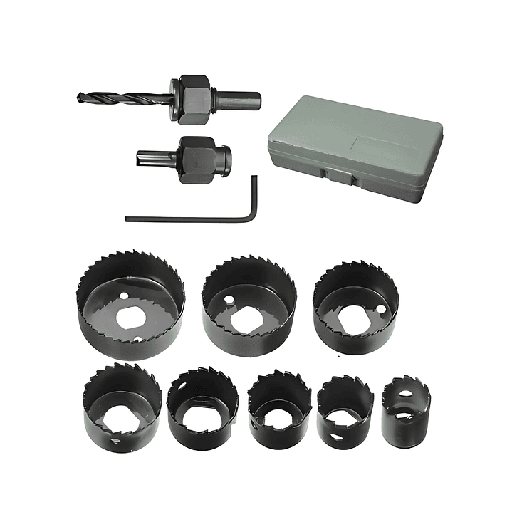🪚 Este kit incluye 8 sierras de corona de distintos diámetros, junto con adaptadores y llave Allen, ofreciéndote la solución perfecta para perforaciones limpias y profesionales en madera, MDF y otros materiales.